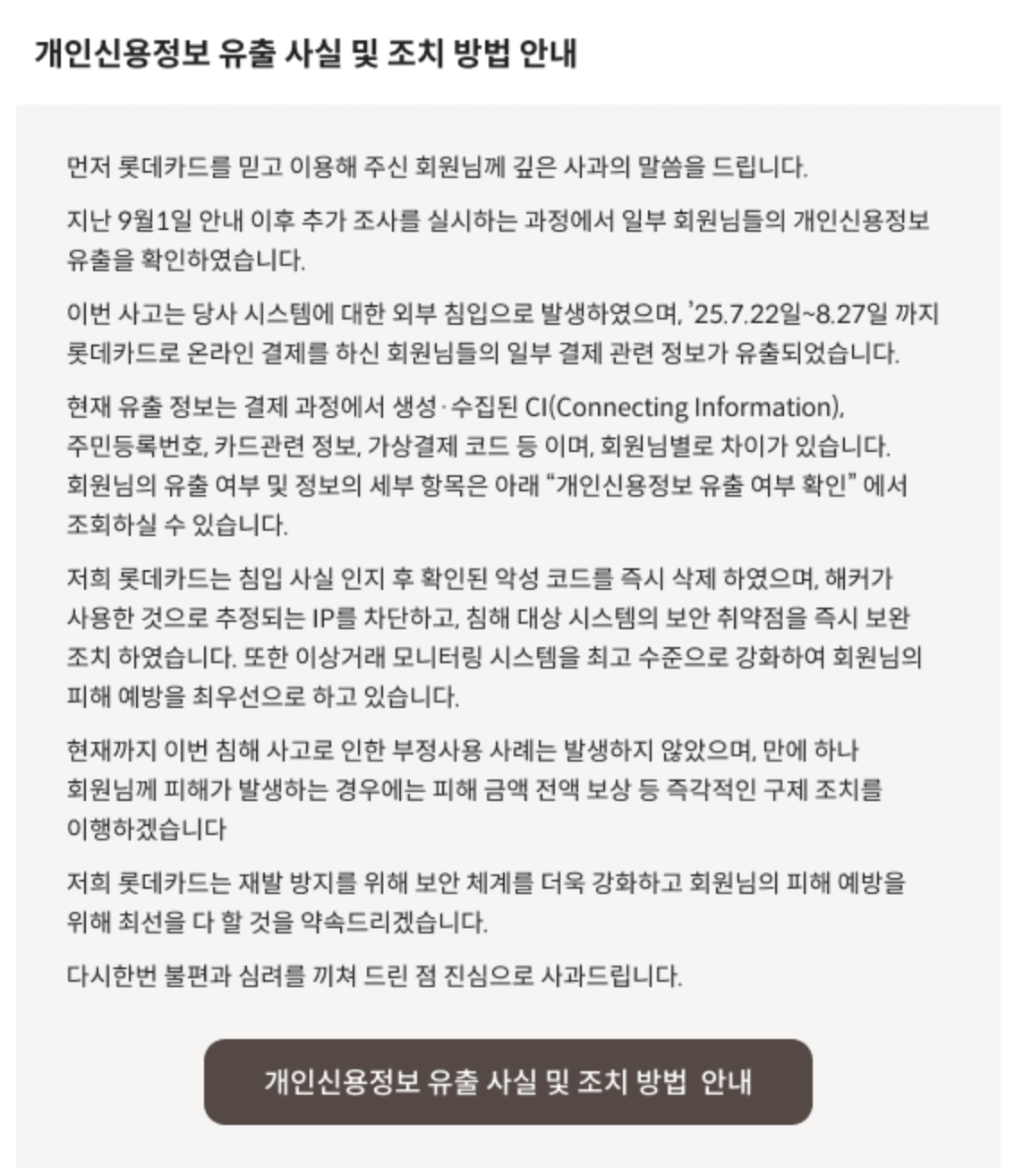 유출된 정보는 지난 7월 22일과 8월27일 사이 해당 온라인 서버를 통해 온라이 결제 과정에서 생성/수집된 데이터로 한정됩니다.