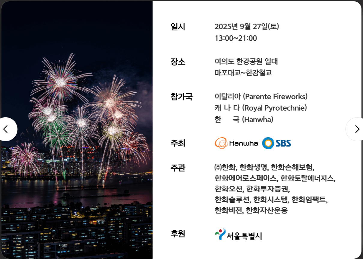 2025년 서울세계불꽃축제가 9월 27일 토요일에 시작됩니다. 올해는 추석 연휴 일정과 겹쳐서 조금 앞당겨졌다고 합니다. 일정, 이벤트 내용과 응모, 준비물등 확인하고 가세요.