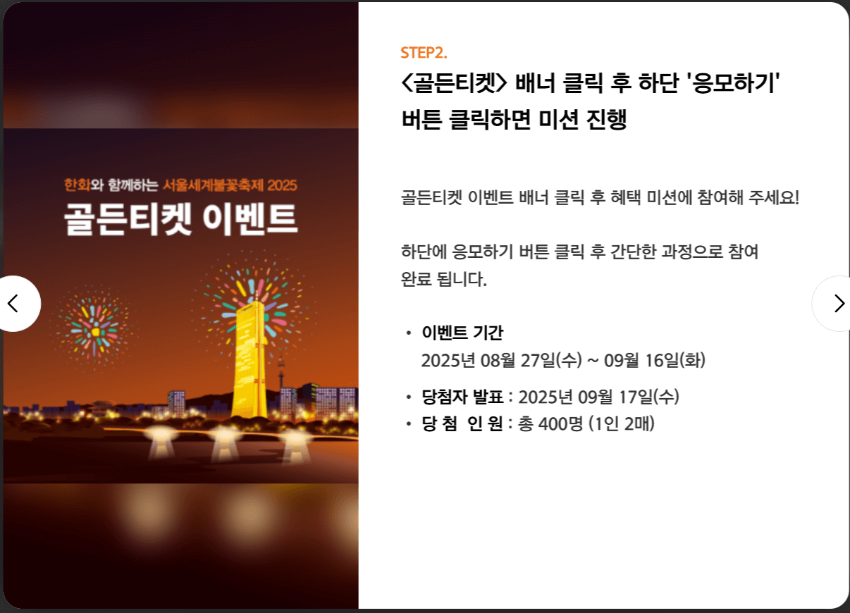 공식 홈페이지( 한화 서울세계불꽃축제 )에 접속하시면 골든티켓 이벤트를 찾으실 수 있습니다. → 불꽃축제 이벤트 응모