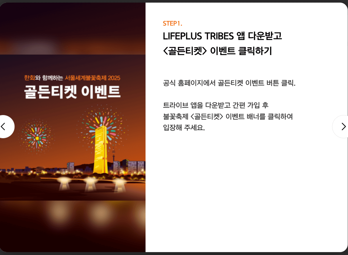 여기에 들어가셔서 트라이브 앱을 다운로드 받으시고 간편 가입까지 해주세요. 그리고 불꽃축제 <골든티켓> 이벤트 배너를 클릭해서 입장하시고 응모해 주시면 됩니다.