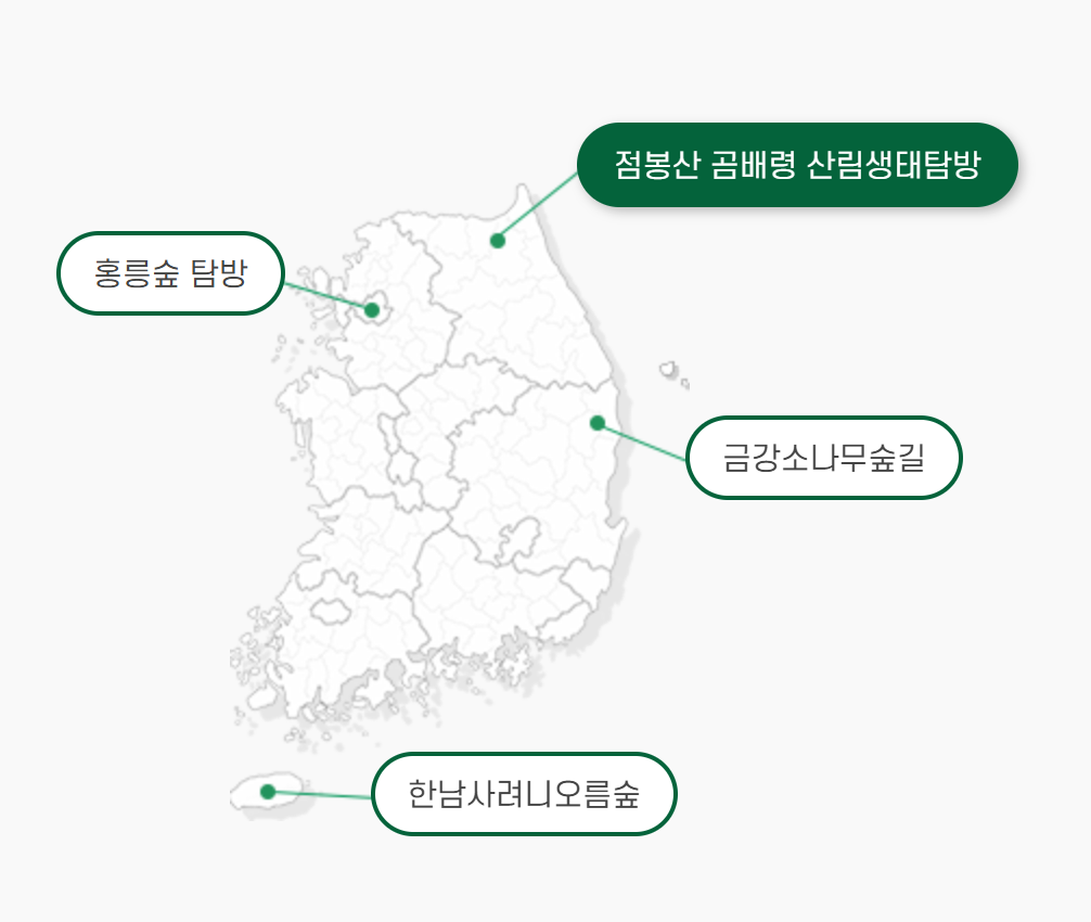 '둘레길', '트레일', '탐방로', '명품숲'의 이름을 하나씩 누르면 관련 사진을 볼 수 있습니다.