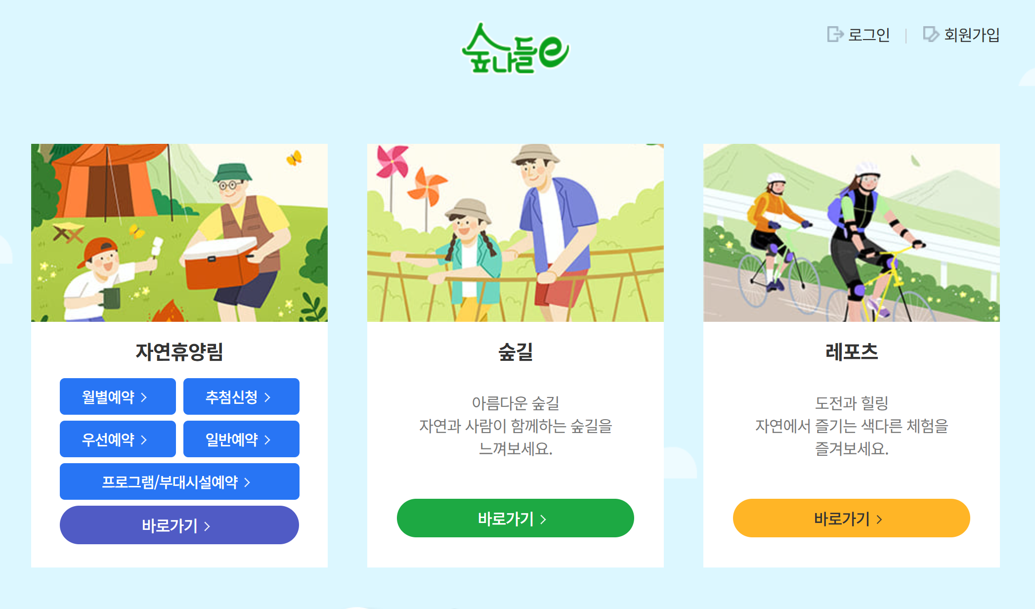 '숲나들e' 홈페이지에 들어갔을때 메인 화면입니다.