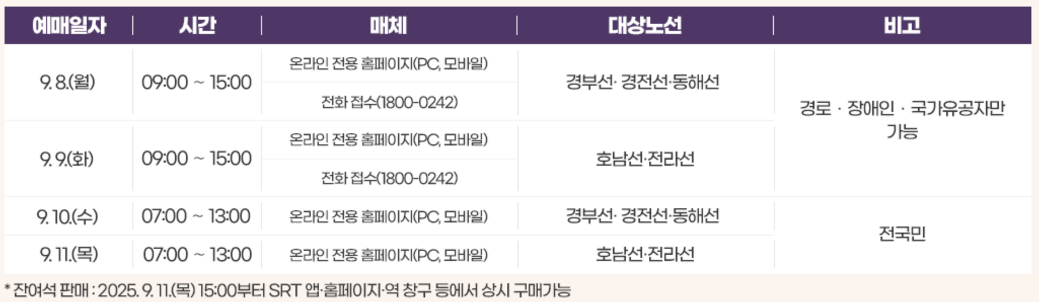 9월 11일(목) 15:00부터 SRT 앱 또는 홈페이지, 역 창구 등에서 잔여석 상시 구매 가능합니다.