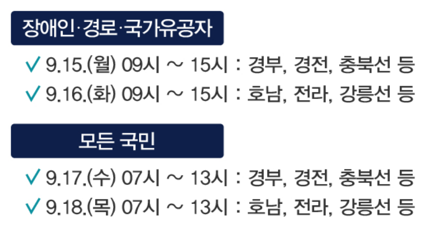 추석연휴 승차권 결제는 18일 오후 5시부터 시작됩니다. 교통약자사전예매 승차권은 24일 밤 12시까지,