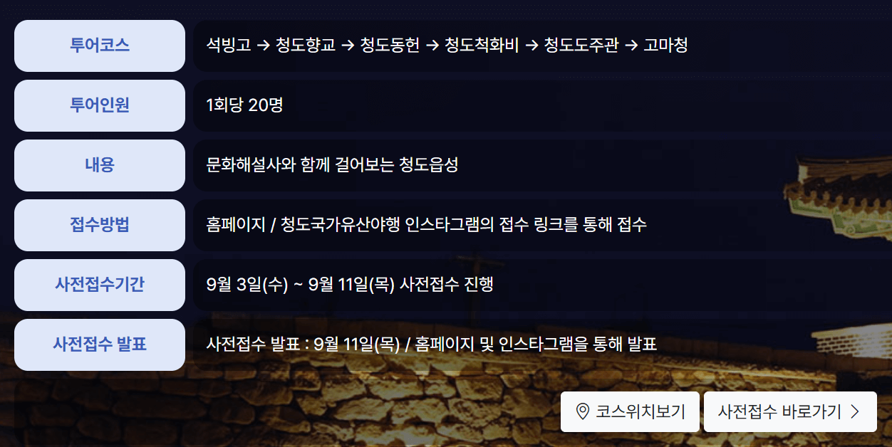 문화해설사의 설명을 들을 수 있는 청도읍성투어가 정말 기대됩니다.